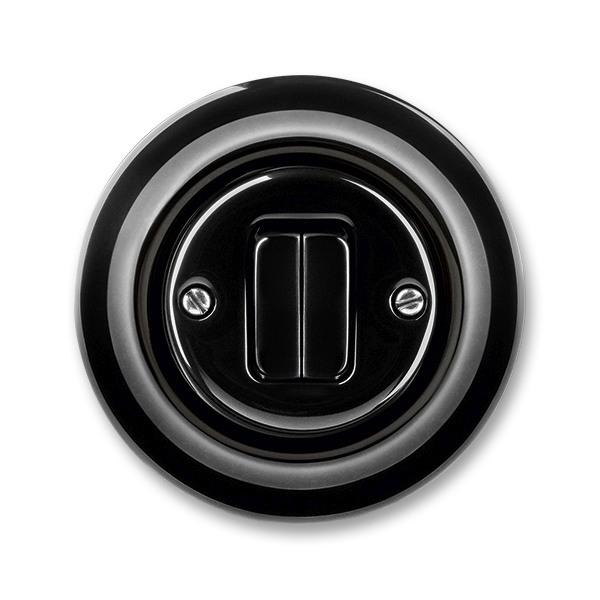 Retro dvojité tlačítko č. 1/0+1/0 ABB Decento v černém, lesklém provedení má dimenzovaný proud 10 A a napětí 250 V. Pro instalaci více přístrojů vedle sebe musí být rozteč středů instalačních krabic alespoň 90 mm. Retro tlačítko má bezšroubové svorky pro vodiče 1-2,5 mm² a je upevněn šrouby.