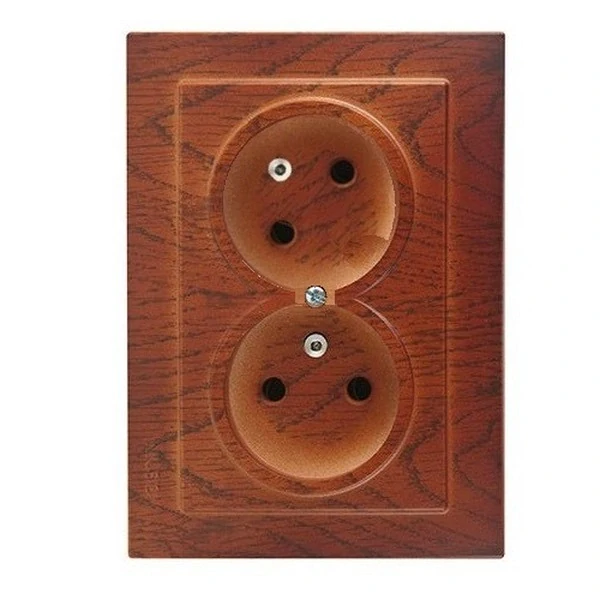 Kompletní složená domovní dvojzásuvka v imitaci středního dřeva třešeň ZE2K-D2 je klasickou dvojnásobnou zásuvkou s ochrannými kolíky 16A / 250V pro montáž do instalačních krabic s minimální výškou 45mm.