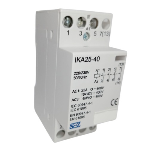 Stykač SEZ IKA25-40/220/230V je jednofázový instalační stykač s jmenovitým pracovním proudem 25A pro napájení 230V.