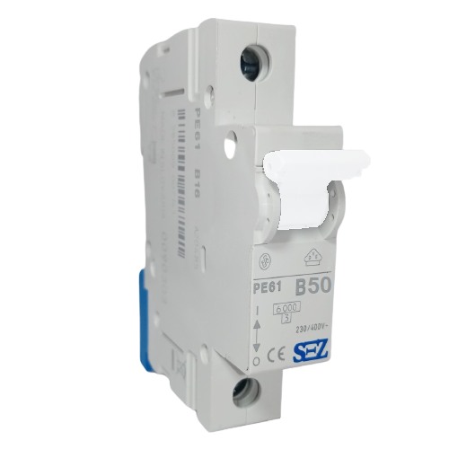 Bytový jednofázový jistič SEZ PE 61-B 50A na DIN lištu je jednopólový jistič s charakteristikou zátěže B a maximálním proudem 50 A a zkratovým proudem 6kA.
