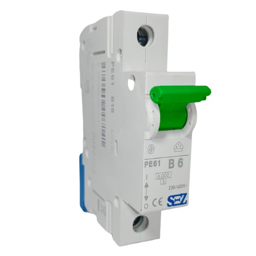 Bytový jednofázový jistič SEZ PE 61-B 6A na DIN lištu je jednopólový jistič s charakteristikou zátěže B a maximálním proudem 6 A a zkratovým proudem 6kA.