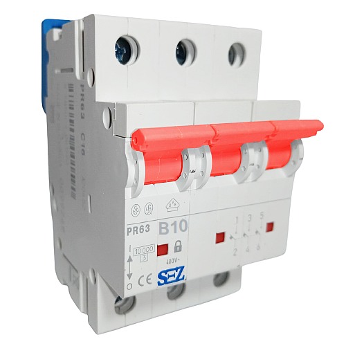Třífázový jistič SEZ PR63 B 10A na DIN lištu je třípólový jistič s charakteristikou zátěže B s maximálním proudem 10 A a zkratovou schopností 10 kA. Jistič slouží k ochraně elektrických obvodů proti přetížení a zkratu.