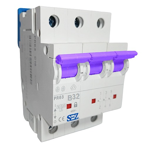 Třífázový jistič SEZ PR63 B 32A na DIN lištu je třípólový jistič s charakteristikou zátěže B s maximálním proudem 32 A a zkratovou schopností 10 kA. Jistič slouží k ochraně elektrických obvodů proti přetížení a zkratu.