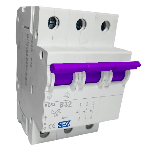 Třífázový jistič SEZ PE 63-B 32A na DIN lištu je třípólový jistič s charakteristikou zátěže B s maximálním proudem 32 A a zkratovou schopností 6 kA. Jistič slouží k ochraně elektrických obvodů proti přetížení a zkratu.