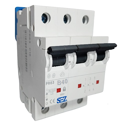 Třífázový jistič SEZ PR63 B 40A na DIN lištu je třípólový jistič s charakteristikou zátěže B s maximálním proudem 40 A a zkratovou schopností 10 kA. Jistič slouží k ochraně elektrických obvodů proti přetížení a zkratu.
