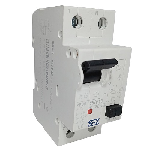 Proudový chránič SEZ PFB2 16/0,3 na DIN lištu je dvoupólový proudový chránič s maximálním proudem 16 A a jmenovitým reziduálním proudem 0,3 A a zkratovým proudem 10 kA. Slouží ochraně elektrických obvodů před svodovými proudy, k ochraně před úrazem elektrickým proudem.