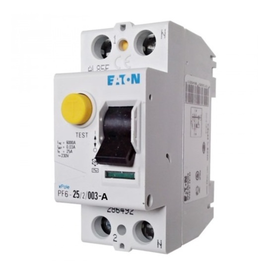 Proudový chránič Eaton 112921 PF6-25/2/003-A na DIN lištu je dvoupólový proudový chránič s maximálním proudem 25 A a jmenovitým reziduálním proudem 0,03 A, k ochraně elektrických obvodů před svodovými proudy, k ochraně před úrazem elektrickým proudem. Typ svodového proudu A.