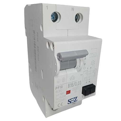 Proudový chránič s nadproudovou ochranou SEZ PFI2 B16/0,1 na DIN lištu je dvoupólový proudový chránič s maximálním proudem 16 A a jmenovitým reziduálním proudem 0,1 A s charakteristikou zátěže B.