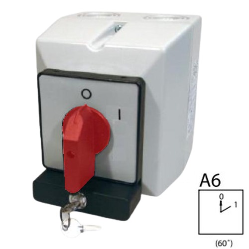 - SEZ S16 JPZ 1104 A6R Vačkový spínač v krytu IP54, uzamykatelný na zámek 16A, 0-1, 4P, červená páčka