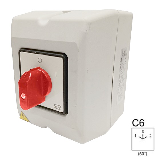 - SEZ S25 JPD 9552 C6R Vačkový spínač v krytu IP65, s čelní deskou, přepínač pólů 25A, 1-0-2, červená páčka