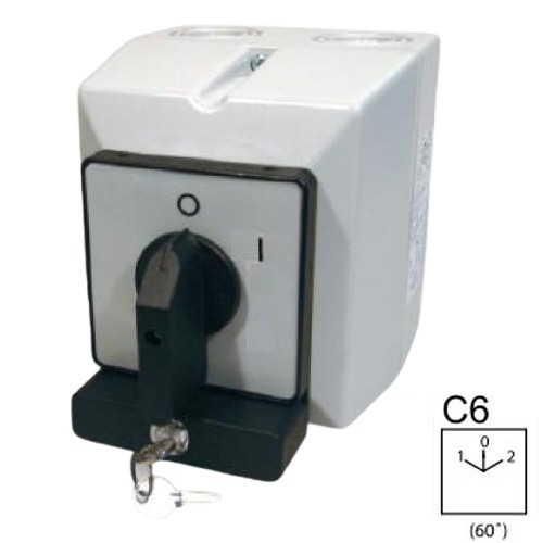 - SEZ S25 JPZ 9151 C6 Vačkový spínač v krytu IP54, uzamykatelný na zámek, reverzační přepínač 25A, 1-0-2