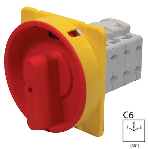 - SEZ S32 JU 2203 C6R Vestavný vačkový spínač, uzamykatelný na visací zámky, přepínač sítí 32A, 1-0-2, červená páčka