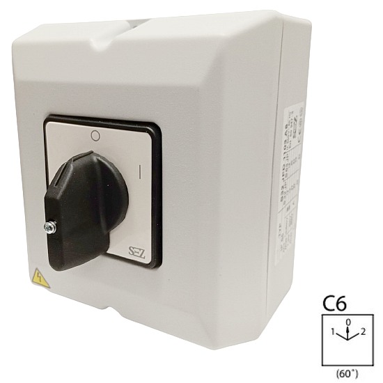 - SEZ S63 JPD 9151 C6 Vačkový spínač s čelní deskou v krabici, reverzační přepínač 63A, 1-0-2