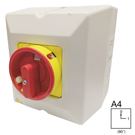 - SEZ S63 JPU 1103 A4R Vačkový spínač v krytu IP65, uzamykatelný na visací zámky 63A, 0-1, 3P, červená páčka
