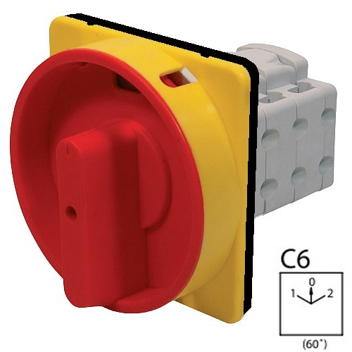 - SEZ S63 JUG 2203 C6R Vestavný vačkový spínač s těsněním,uzamykatelný na visací zámky, přepínač sítí 63A, 1-0-2 červená páčka