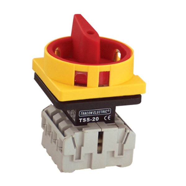 - Bezpečnostní hlavní vypínač žluto-červený Tracon TSS-10/4 400V, 50Hz, 100A, 4P, 30kW, 64×64mm
