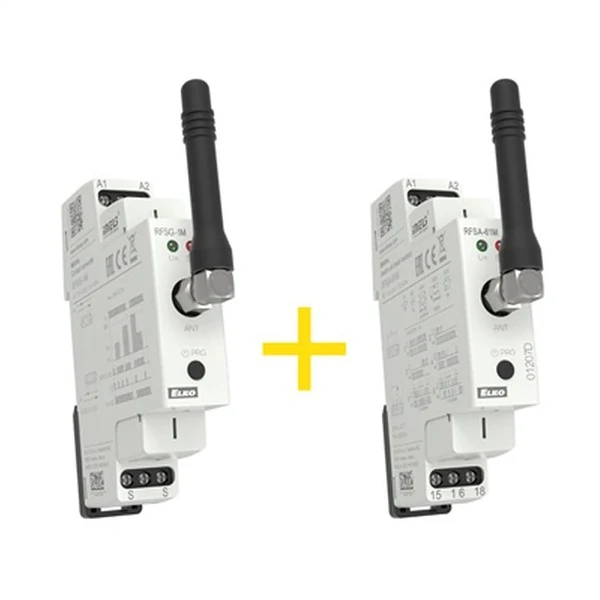 Sada se skládá z: RFSG-1M bezdrátového převodníku kontaktu ( vysílač ) a jednokanálového spínacího prvku ( multifunkční spínač ) RFSA-61M ( přijímač ).
