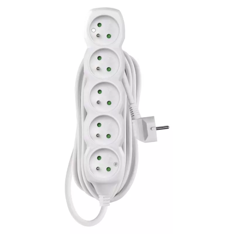 Bílý prodlužovací přívod, 5 zásuvka s délkou 5 m a průřezem vodiče 1 mm2. Vhodný pro maximální zátěž 10 A max.