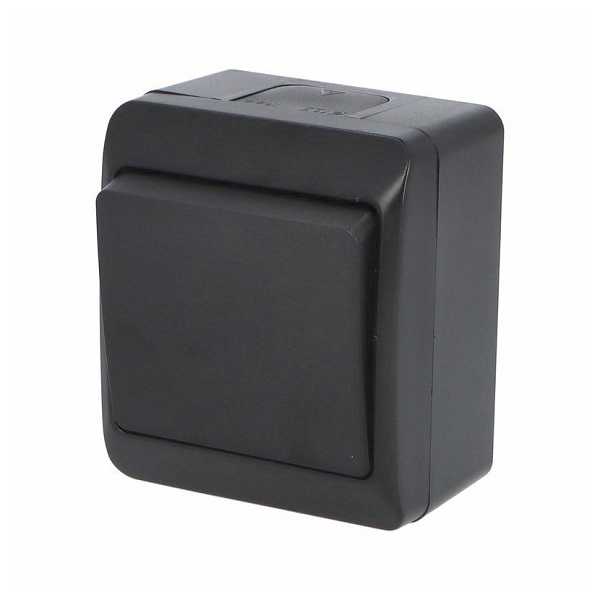 Venkovní vypínač č.6 Famatel 5331-09 GALATEA IP44 v černé barvě s krytím IP44 pro venkovní instalaci a montáží na zeď.