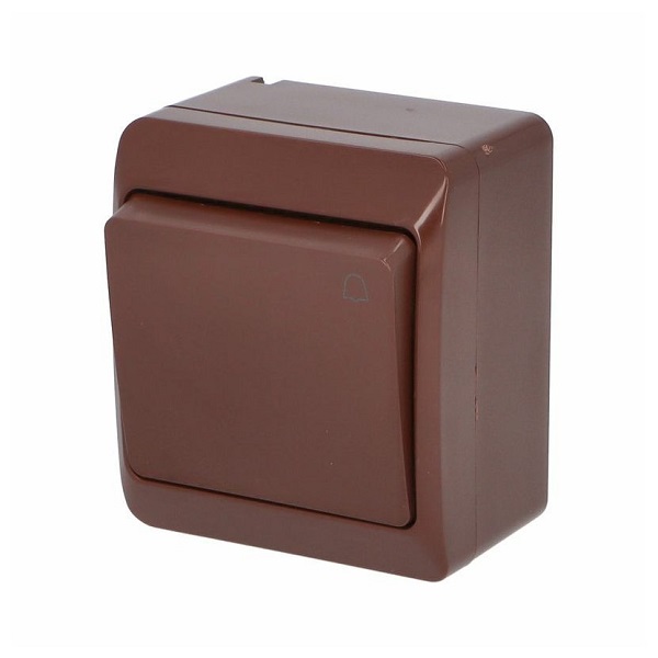 Venkovní vypínač tlačítko Famatel 5337-06 GALATEA IP44 se symbolem zvonku v hnědé barvě s krytím IP44 pro venkovní instalaci a montáží na zeď.