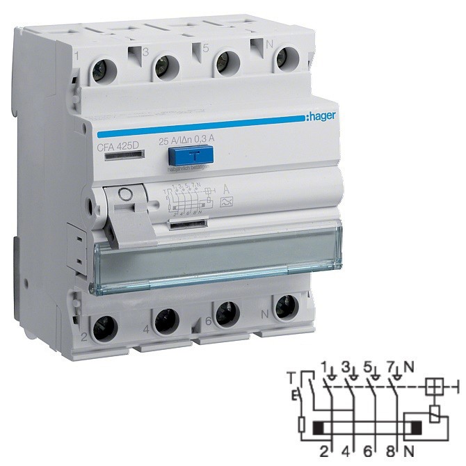 Proudový chránič Hager CFA425D na DIN lištu je čtyřpólový proudový chránič s maximálním proudem 25 A a jmenovitým reziduálním proudem 0,3 A, zkratovým proudem
