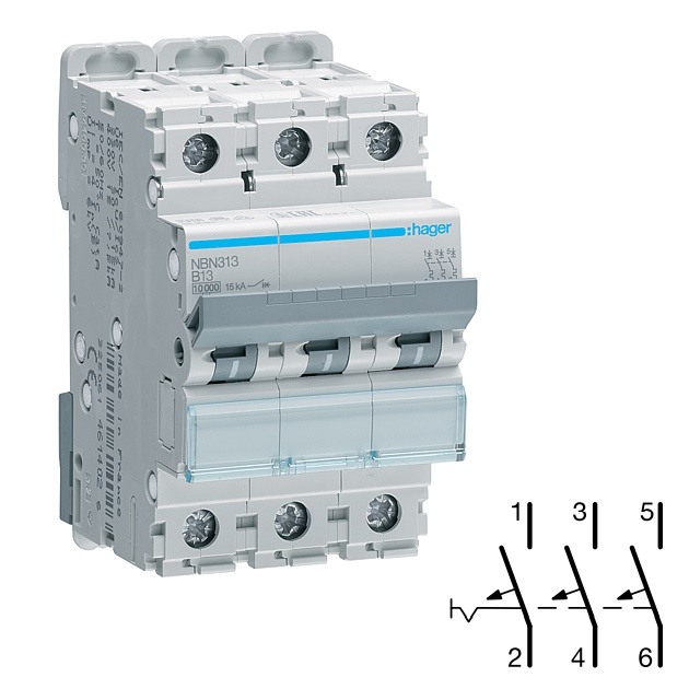 - HAGER NBN313 Jistič 3 pól. 13A, charakteristika B, 10 kA