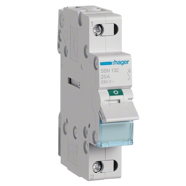 Instalační vypínač HAGER SBN132 na DIN lištu je 1-pólový vypínač, jmenovitý proud 32A pro spolehlivé vypínaní elektrických obvodů.