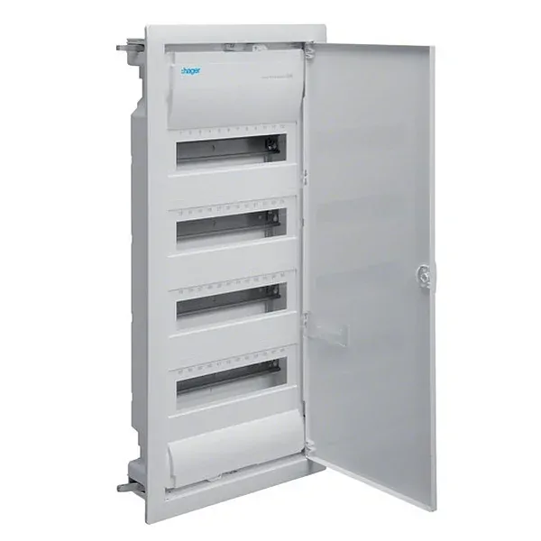 Plastová rozvodnice HAGER VH48NE do dutých příček volta,, s krycím rámečekem a dvířky z ocelového plechu 4-řadá, 48 + 8 mod., s krystím IP 30.