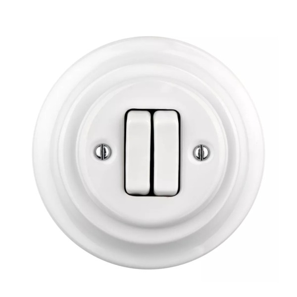 Keramický kolébkový vypínač, č. 5 (6+6), bílý je ručně vyráběný designový prvek, který kombinuje tradiční řemeslné zpracování s moderní funkčností. Vyroben z kvalitní keramiky, nabízí estetiku vhodnou do luxusních interiérů, moderních domů, restaurací i roubených chaloupek. Jeho čistý bílý odstín a jemné tvary podtrhují retro charakter a zároveň ladí s aktuálními interiérovými trendy. Vypínač poskytuje spolehlivé ovládání osvětlení a stane se ozdobou každé stěny.