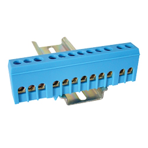 Modrý uzavřený můstek na din lištu v podobě nulovací svorkovnice pro 12 vodičů, svorkovnie pro průřez vodičů 2,5 - 16 mm2.