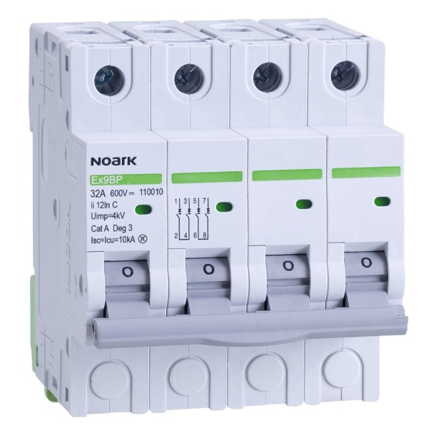 - Noark 110006 Ex9BP 4P DC600V C10 DC instalační jistič 10 kA pro PV aplikace, charakteristika C, 10 A, 600 V DC, šířka 4TE