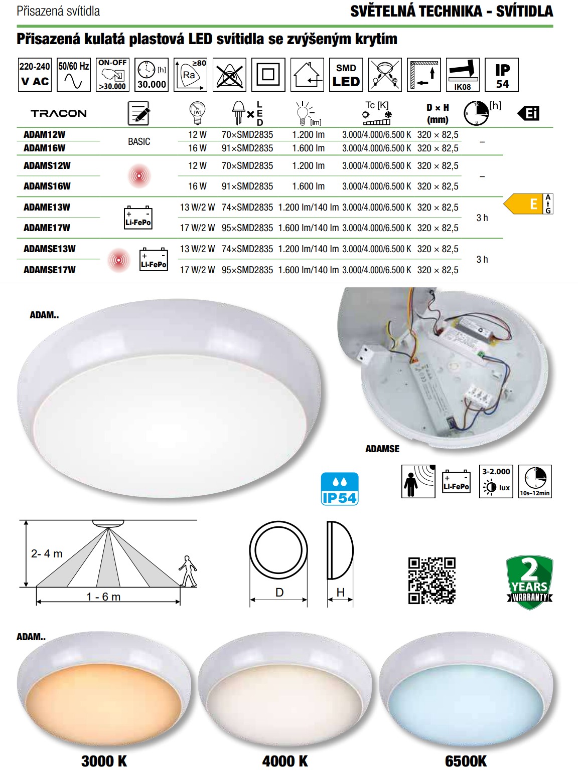 - Tracon ADAM16W Přisazené plastové kulaté LED svítidlovyšší krytí, nastavite 230 VAC, 16 W, 1600 lm, 3000/4000/6500 K, IP54, EEI=E
