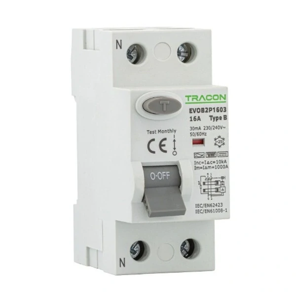 Proudový chránič Tracon EVOB2P803, 2-pólový s napětím do 500 V, proudem 80 A, 300mA, zkratovou odolností 10 kA, typ svodového proudu B zajišťuje efektivní ochranu proti nebezpečným elektrickým úrazům.