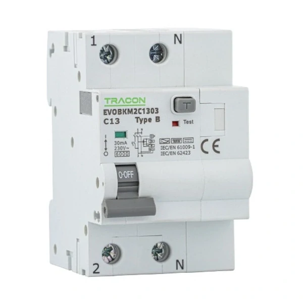 Kombinovaný proudový chránič Tracon EVOBKM2B1303, 2-pólový, 3-modulový s napětím 230 V, proudem 13 A, 30mA, zkratovou odolností 6 kA, charakteristika B, typ svodového proudu B zajišťuje efektivní ochranu proti nebezpečným elektrickým úrazům.