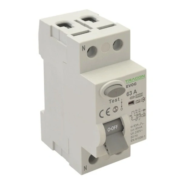 Proudový chránič Tracon EVOG2P251, 2-pólový s napětím 230 V, proudem 25 A, 100 mA, zkratovou odolností 6 kA, zajišťuje efektivní ochranu proti nebezpečným elektrickým úrazům.