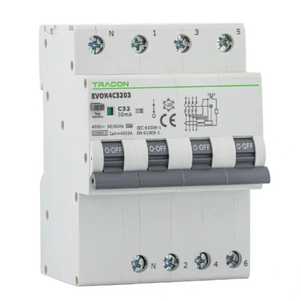 Kombinovaný proudový chránič Tracon EVOK4C1603, 4-pólový, 4-modulový, s napětím 400 V, proudem 16 A, 30mA, zkratovou odolností 10 kA, typ svodového proudu A, charakteristika C zajišťuje efektivní ochranu proti nebezpečným elektrickým úrazům.
