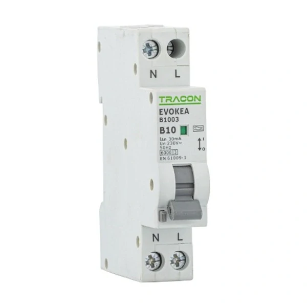 Kombinovaný proudový chránič Tracon EVOKEAC1603, 2-pólový, 1 modulový, s napětím do 230 V, proudem 16 A, 30mA, zkratovou odolností 6 kA, typ svodového proudu A, charakteristika C zajišťuje efektivní ochranu proti nebezpečným elektrickým úrazům.