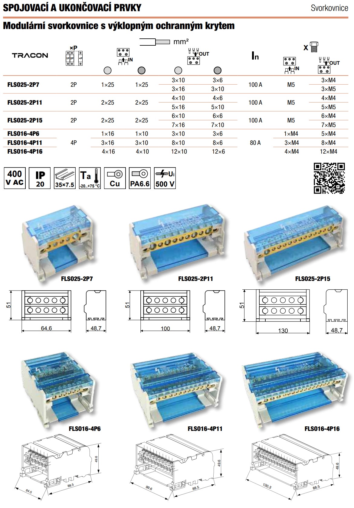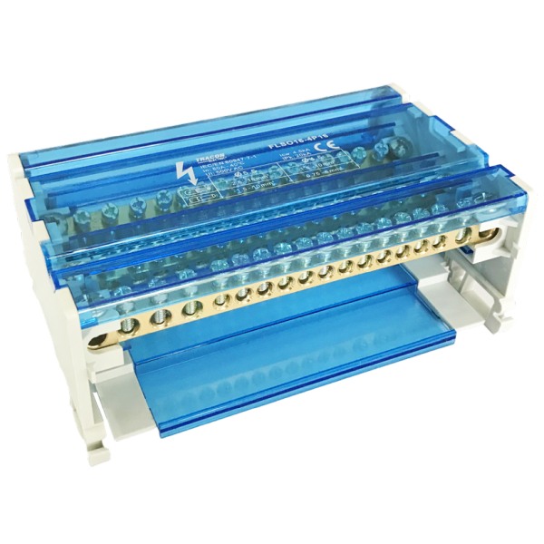 - Tracon FLSO16-4P16 Modulární svorkovnice s výklopným ochranným krytem 4×16(10) mm2 / 12×10(6) mm2, 500VAC/DC, 80A