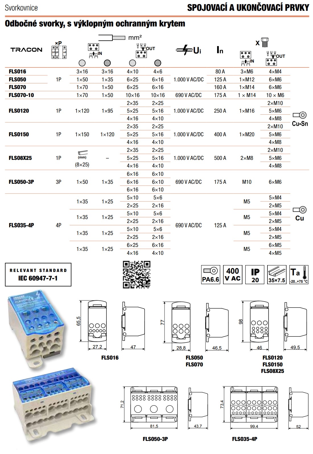 - Tracon FLSO70-10 Odbočná svorka s výklopným ochranným krytem 1×70(50)mm2 / 10×16mm2, 690VAC/DC, 175A