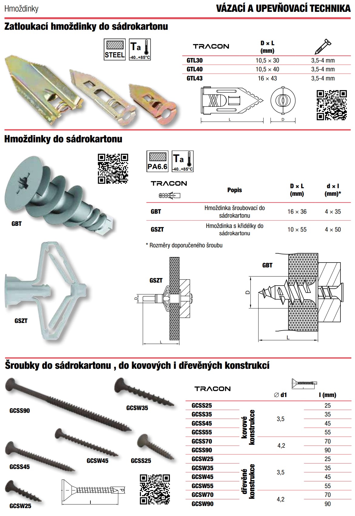 - Tracon GBT Hmoždinka šroubovací do sádrokartonu L=36mm, D=16mm, PA6.6 (balení 100 ks)