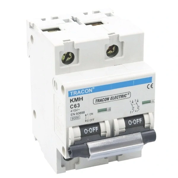 Výkonový jistič Tracon KMH-280 2-pólový na DIN lištu s charakteristikou C, max. poud 80 A, se spínací schopností do 6kA.