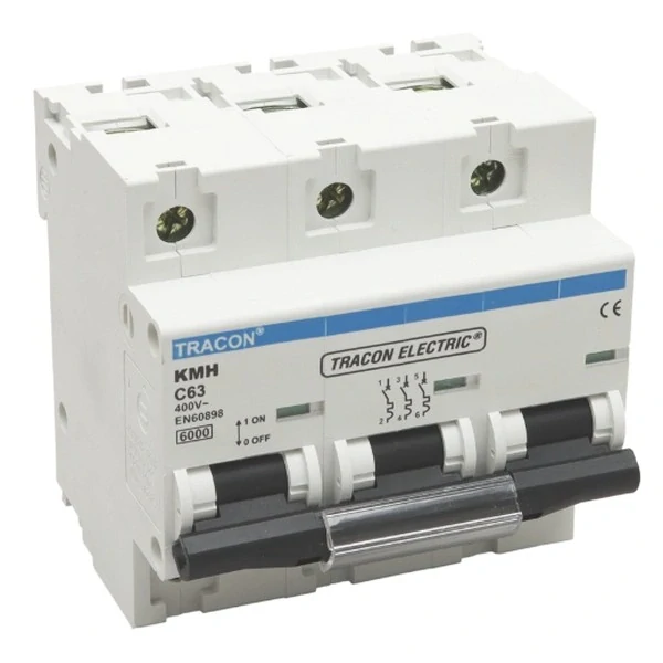 Výkonový jistič Tracon KMH-380 3-pólový na DIN lištu s charakteristikou C, max. poud 80 A, se spínací schopností do 6kA.