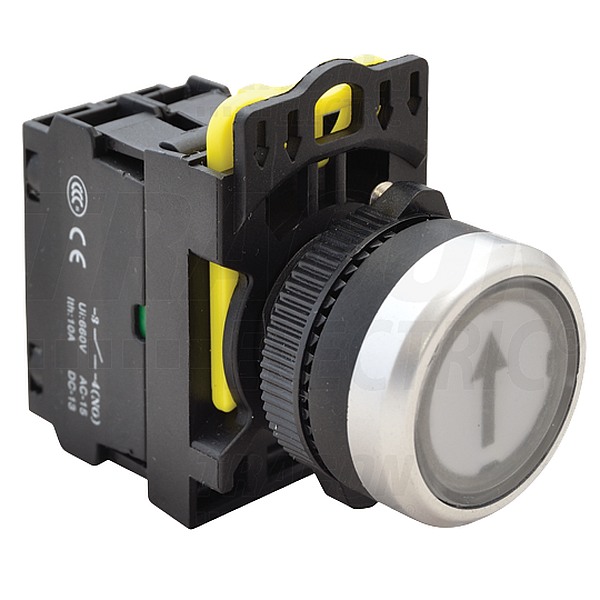 Tracon NYK3-P3L Tlačítkový spínač podsvětlenýs popisem,bílý ( černá šipka ) 1×NO, 5A/230V AC-15, IP65, LED 230V AC/DC