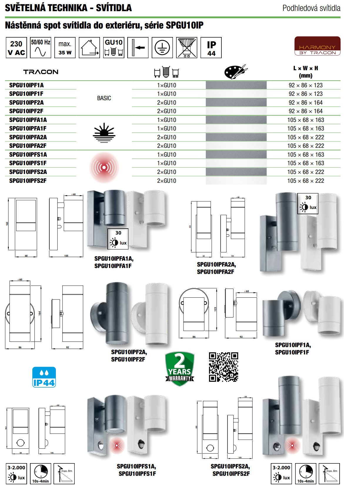 - Tracon SPGU10IPFA2F Nástěnné bodové svítidlo, exterier., bílé, soumrak. spínač 100-240VAC, 50Hz, 2xGU10, max.35W, 30lux, IP44