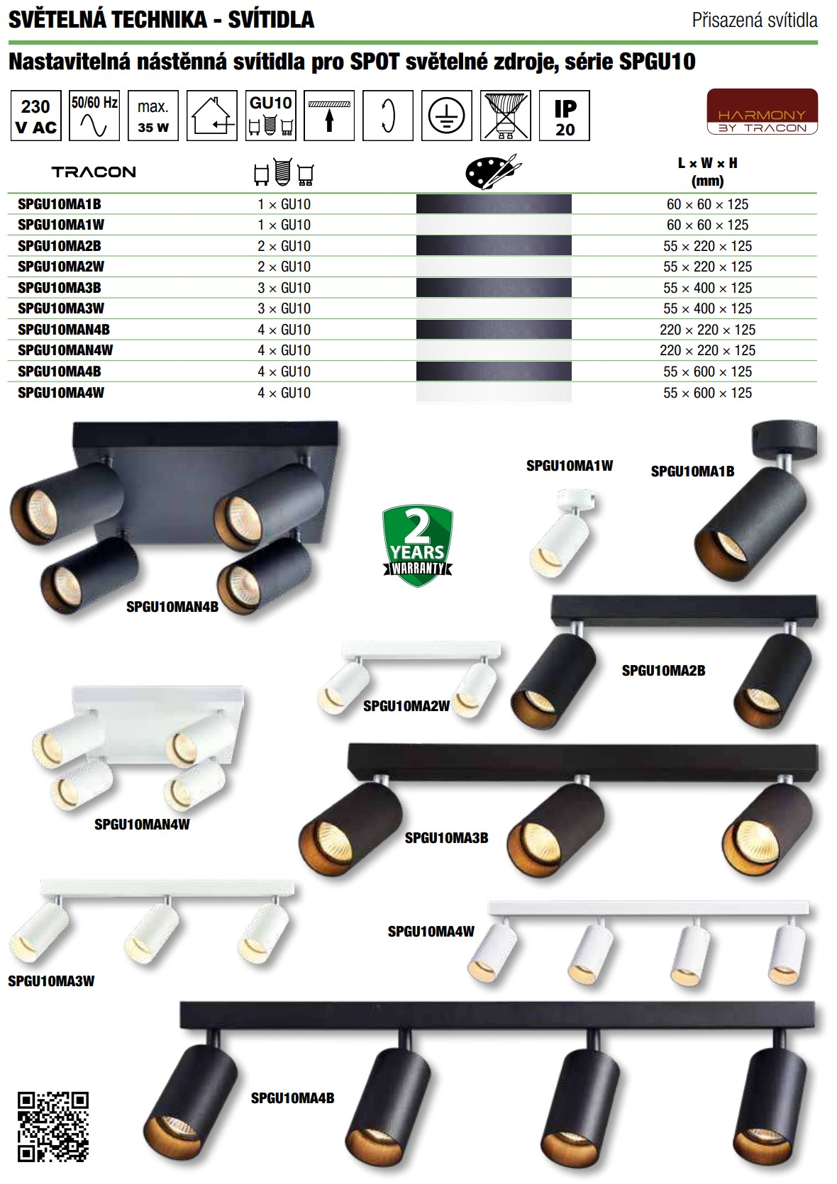 - Tracon SPGU10LMA2W Stropní nastavitelné bodové svítidlo, bílé 100-240VAC, 50Hz, 2xGU10, max.2x35W