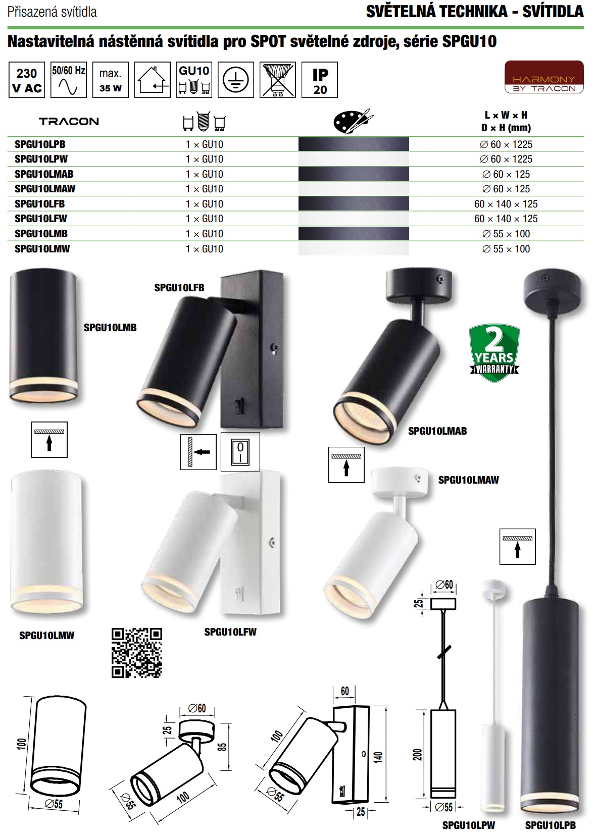 - Tracon SPGU10LPW Závěsné bodové svítidlo, bílé 100-240VAC, 50Hz, 1xGU10, max.35W