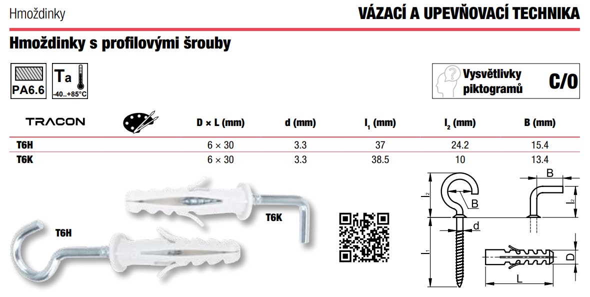 - Tracon T6H Hmoždinky lemované + hák 'C',šedé 6×30mm, PA6.6