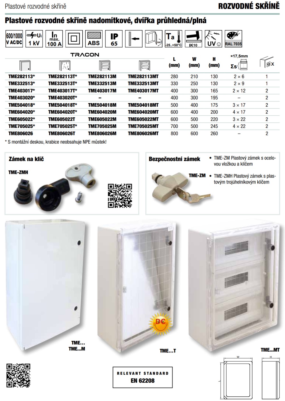 - Tracon TME282113T Plastová rozvodná skříň, s průhl. dvířky H×W×D=280×210×130mm, IP65, IK10, 1000V AC/DC, RAL7035