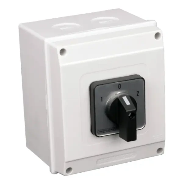 - Vačkový přepínač, 1-0-2, v krabici Tracon TKV-206/4T65 400V, 50Hz, 20A, 2×4P, 5,5kW, 48×48mm, 60°, IP65
