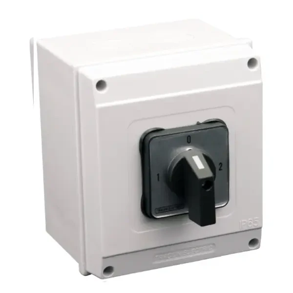 - Vačkový přepínač, 1-0-2, v krabici Tracon TKV-259/4T65 400V, 50Hz, 25A, 2×4P, 7,5kW, 48×48mm, 90°, IP65